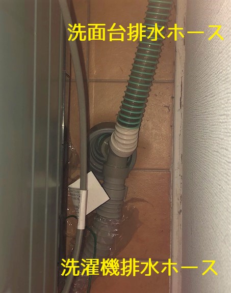 排水口は1つしかないので、洗面台の排水ホースと洗濯機の排水ホースを分岐パーツでつないで、排水口に差し込みます。