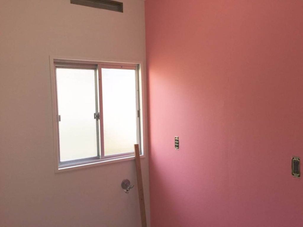 後日、ピンクの壁紙は凸凹が気になり、貼り直すことになります。(耐クラック用や、スリット壁紙のほとんどが白系の壁紙のため、柄や色の壁紙は下地が出てしまうことを覚悟して貼りましょう・・・)